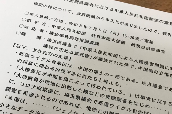 埼玉県議会では2021年の7月、対中人権問題非難の意見書が可決すると、議会事務局に「意見書は誰が作成したのか」「賛成討論した鈴木正人議員は何期か」と、中国大使館の参事官から高圧的な内容の電話がかかってきた。