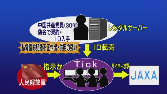 2016年に宇宙航空研究開発機構(JAXA)、更に防衛や航空関連企業を含む約国内約200のの企業や研究機関を狙った大規模なサイバー攻撃に関わった疑いが強まったとして、警視庁公安部は2021年4月20日、私電磁的記録不正作出・同供用の疑いで中国共産党員でシステムエンジニアの30代の男を書類送検する方針を固めた。